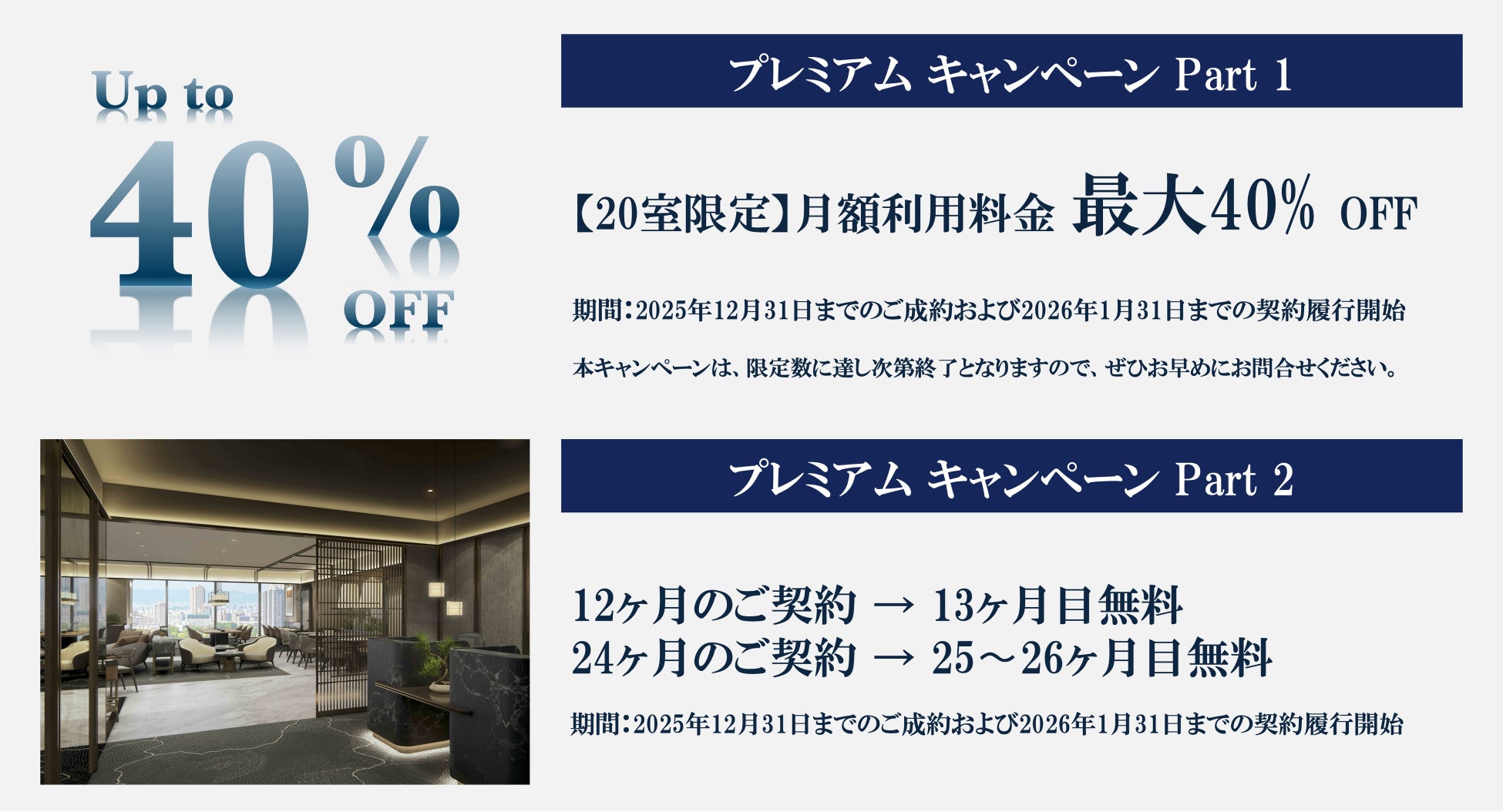大阪で最も注目度が高い商業複合施設「グラングリーン大阪」に誕生した上質を極めたシェアオフィスを、魅力的な条件でご契約いただけるチャンスをぜひお見逃しなく。