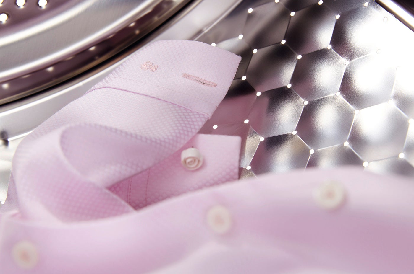 Mieleのランドリーケアを支える軸となるのが、特許を取得*した「ハニカムドラム」。蜂の巣のような特殊な形状で、ドラムが回転すると、ドラムと衣類の間に水・空気の薄膜が形成されます。それがクッションがわりとなり、衣類同士の摩擦や衝撃によるダメージを最小限に抑えます。