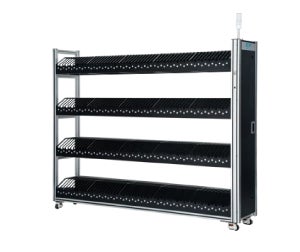 従来の固定式ラックのみの運用では、正確な電子部品の払い出しは可能になるものの、出庫したリールは箱に入れて生産現場に運び、リールセットアップ時に箱から探す必要がありました。この「探す時間」が生産効率を低下させる要因になることに注目し、今回展示する移動式スマートリールラックでは、固定式ラックから移動式ラックに部品を移し、移動式ラックは実装機のスロット番号順に一個ずつ出庫することが可能です。これにより、生産現場でのリール探しが不要となり、「探す時間ゼロ」を実現します。