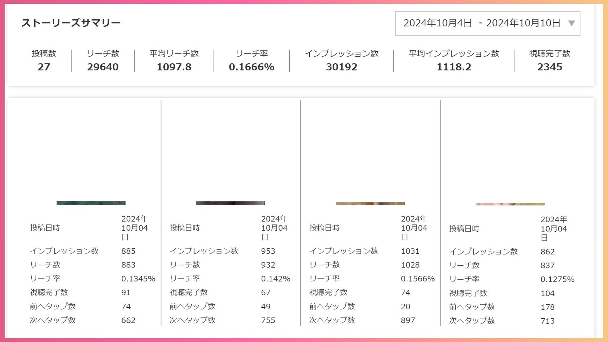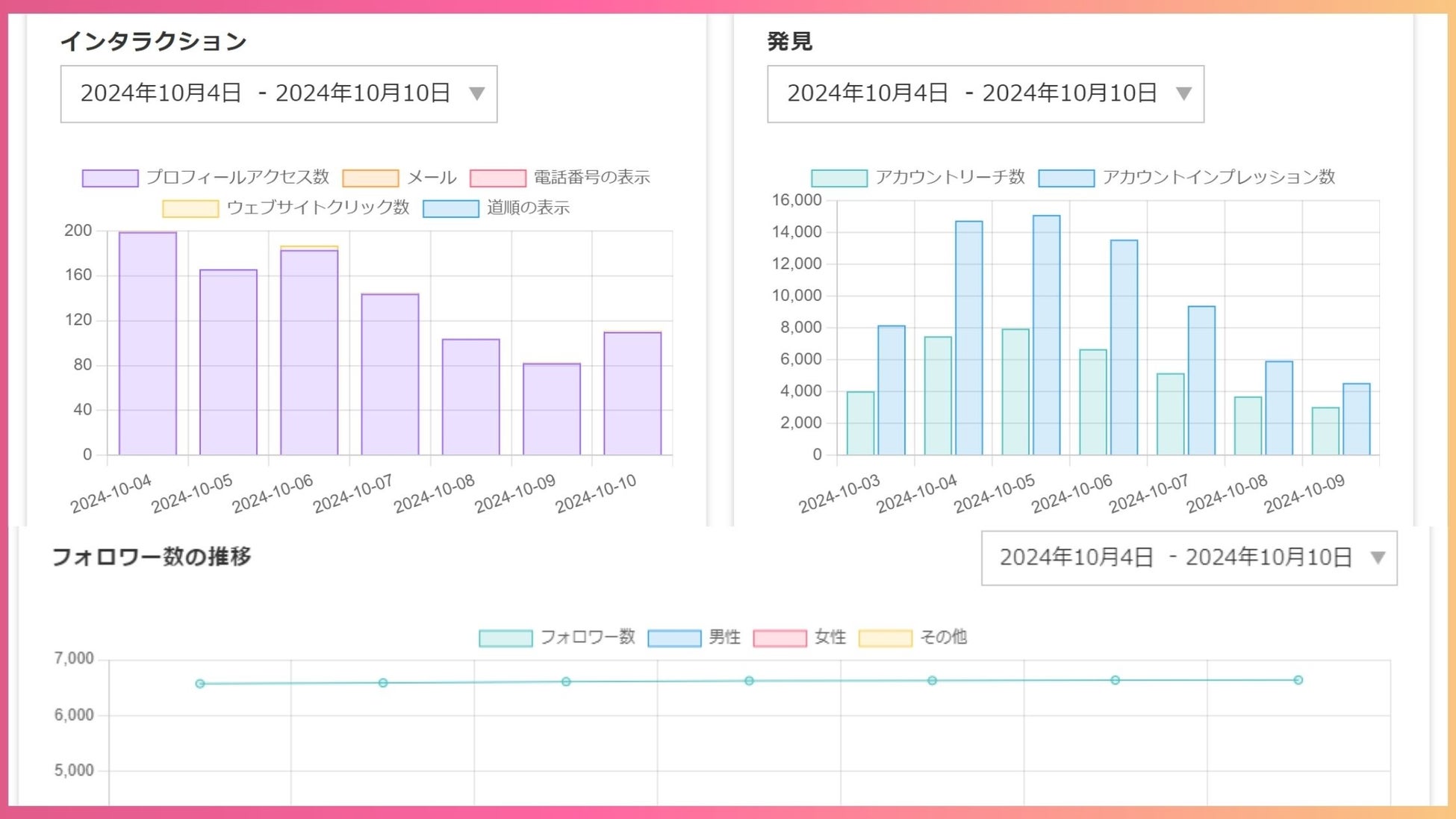 フォロワーの構成比や年齢層、投稿やストーリーズごとの分析数値を期間指定でご覧いただけます。