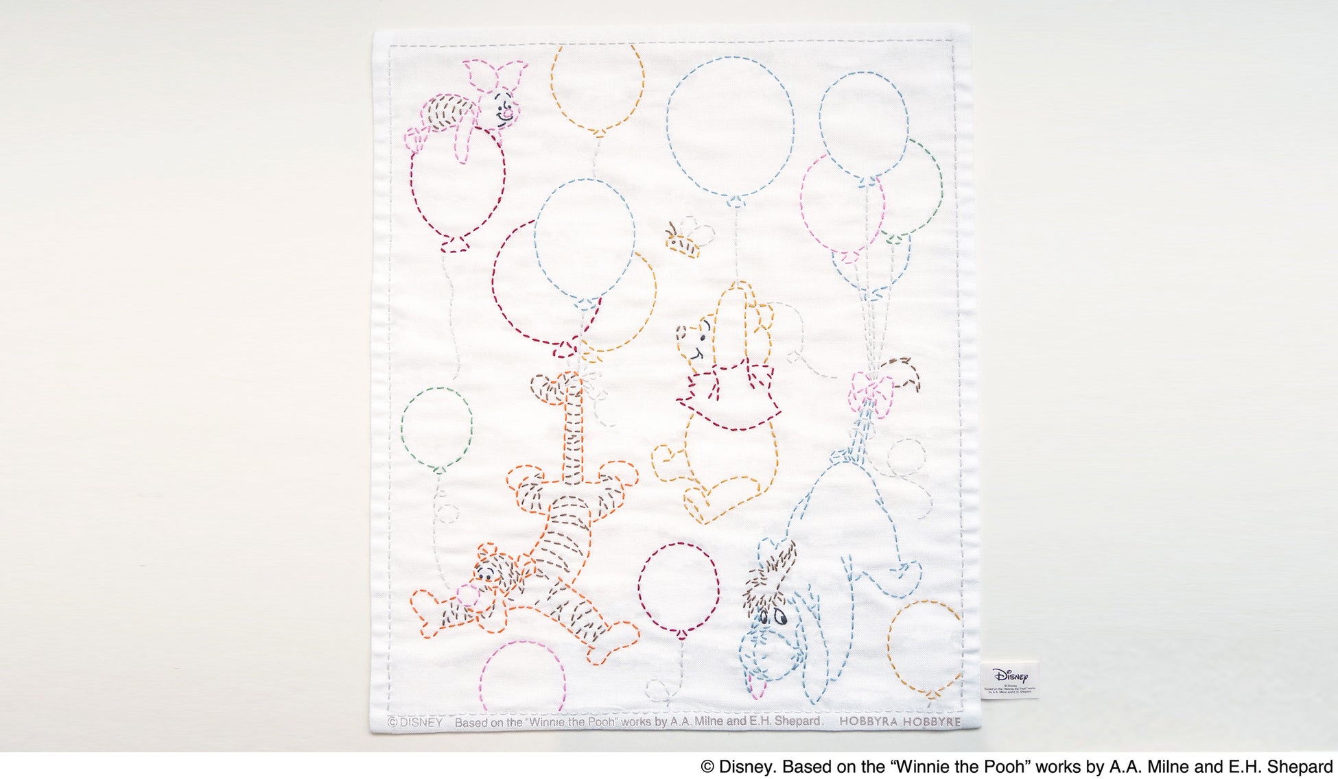 くまのプーさんと森のなかまたちが、カラフルな風船にぶら下がって空を飛ぶ楽しいデザインの刺し子を発売。手芸を気軽に始められるアイテムでプーさんファンへのギフトにもおすすめ。