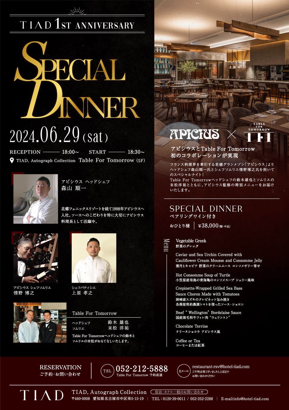 「TIAD, オートグラフ コレクション」(所在地:名古屋市中区栄5-15-19、総支配人:中澤旬史、以下 TIAD)は、TIADの1周年を記念するスペシャルディナーをお届けします。
