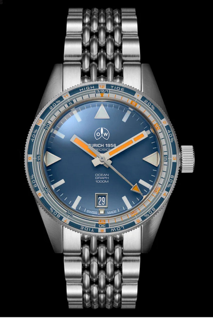 潮位/潮汐サイクル/60分の計測を可能にした3層構造ベゼル、ブルーとオレンジの対比色を強化し低照度での視認性を確保する文字盤、39.5mmのコンパクト径ケースや軽量で乾燥性の高いストラップ(グローブ着用に対応)など、数々の緻密な調整を加え、一流ダイバーの競技対応へのこだわりとオレッヒ&ワイスの機能至上主義を結集したシグネーチャーモデルです。