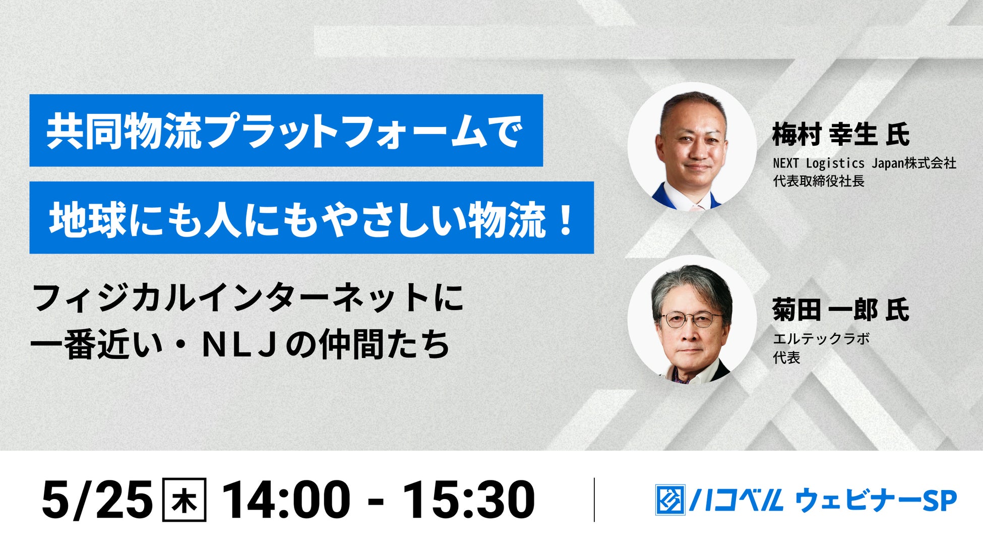 物流プラットフォーム「ハコベル」を展開するハコベル株式会社(本社:東京都品川区、代表取締役社長CEO:狭間 健志、以下:ハコベル)は5月25日(木)に、NEXT Logistics Japan株式会社 代表取締役社長 CEO 梅村 幸生氏、 L-Tech Lab 菊田 一郎氏の両名をお迎えし「共同物流プラットフォームで地球にも人にもやさしい物流!~フィジカルインターネットに一番近い・NLJの仲間たち~」を開催することをお知らせいたします。