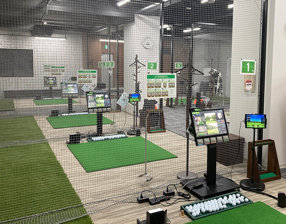 都市型ゴルファーのライフスタイルに合わせ、オールシーズン快適な室内で、お好きな時にゴルフのレッスンが楽しめます。道具(ゴルフクラブ・ゴルフシューズ)は無料レンタルしているので、仕事帰りでも手ぶらでOK。全打席に弾道測定機とスイング解析機も完備しております。