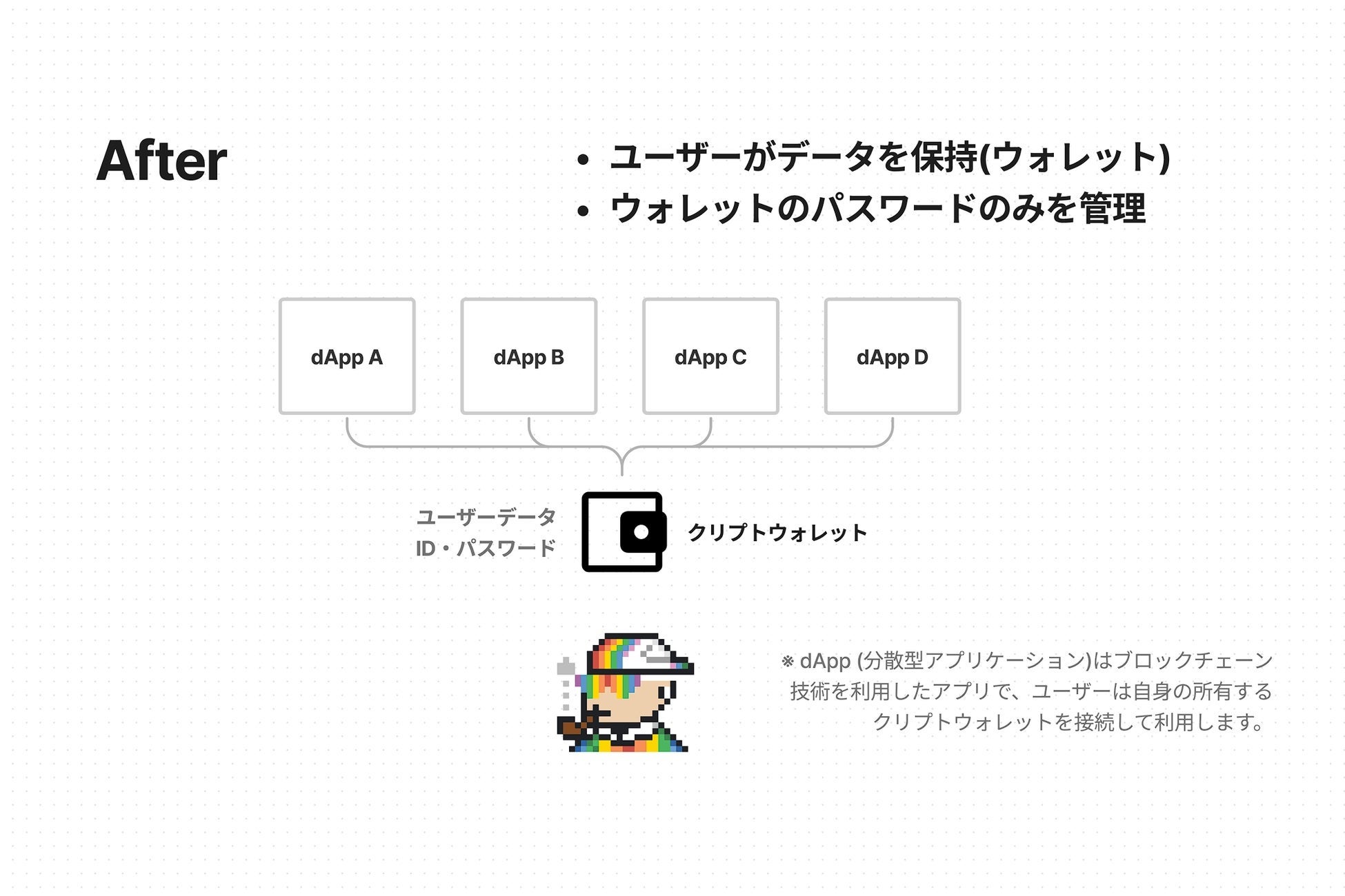 ブロックチェーンを活用した Web3 の世界では、ユーザーがそれぞれ安全に暗号化された状態でデータを保持するようになります。今までは様々なアプリにアカウントを登録し、それぞれのアプリがあなたのデータを保持していました。アプリはあなたの情報を比較的自由に利用でき、削除したり、故意にあなたにサービスを使わせないこともできます。また、もしあなたの登録するアプリにセキュリティインシデントが発生すれば、あなたのデータは流出する恐れがあります。Web3 アプリ(ブロックチェーンアプリ)では、ユーザーは自身の所有するクリプトウォレットにデータを保持します。もはや dApp(分散型アプリケーション)はユーザー情報を保持する必要がなくなり、セキュリティインシデントの可能性は大幅に低くなりました。ユーザーデータはそれぞれのクリプトウォレットに分散しているため、悪意のある攻撃者は今までのようにいっぺんに大量のリストを手に入れることはできなくなります。