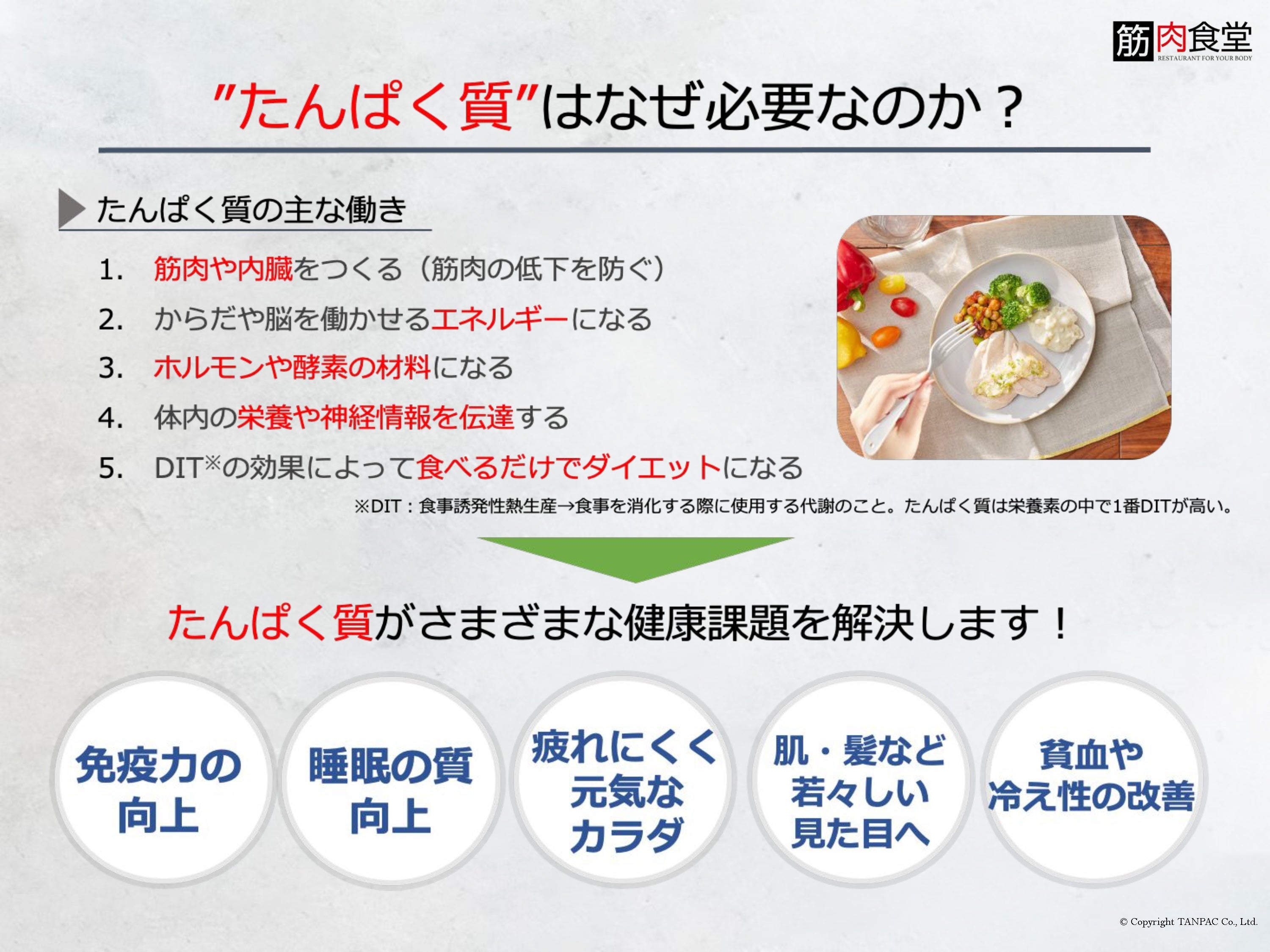 「たんぱく質」は体の大半を占める栄養素で、「疲労回復」「免疫力の向上」「貧血や冷え性の改善」など、さまざまな健康課題を解決しますが、昼食では不足しがちです。