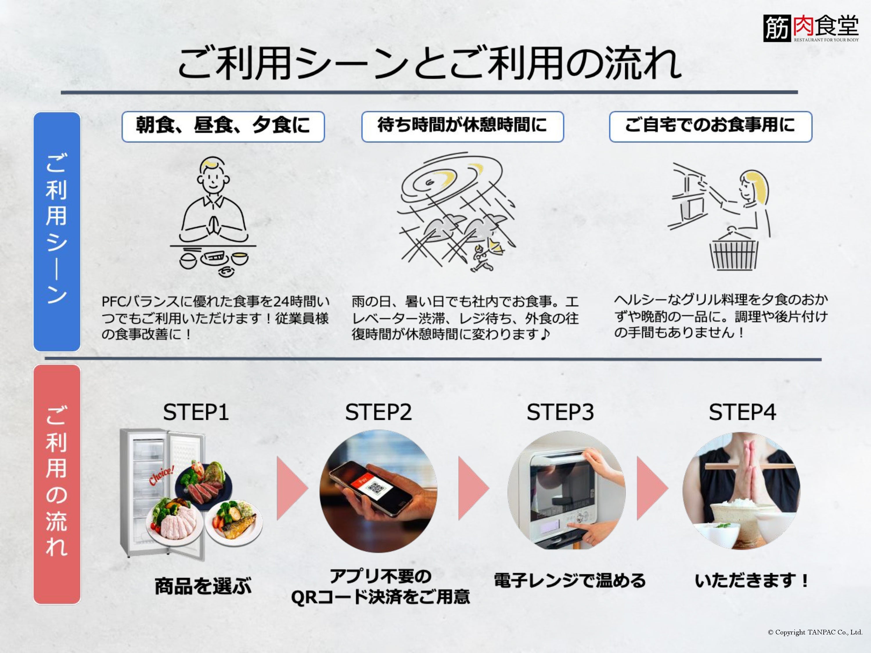 『筋肉食堂』とは、TANPAC 株式会社が運営するレストランです。健康志向の高まりをうけ、近年爆発的に人気を伸ばしているレストランです。日々トレーニングしている方、本格的にダイエットしたい方、ボディーラインやお腹周りが少し気になってきた方など、カラダづくりを志す人のための美味しい高たんぱく低カロリーメニューを提供しています。都内で展開している4店舗には多くの芸能人、スポーツ選手が来店しています。
