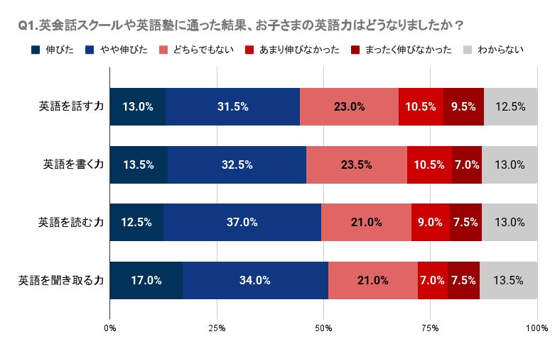 Q1で「英会話スクール、英語塾に通った結果、お子さまの英語力はどうなりましたか?」と質問したところ、愛媛県では英会話スクールや塾に通って英語のスキル向上を明確に感じられなかったと感じている人が一定数いることが分かりました。具体的には、英語を話す、書く、読む、聞き取る各スキルにおいて、「伸びた」と感じる人は12.5%~17.0%であり、一方で「あまり伸びなかった」や「まったく伸びなかった」と回答した人が合わせて14.5%~20.0%となっています。特に、「英語を話す力」と「英語を書く力」においては「あまり伸びなかった」と「まったく伸びなかった」の合計がそれぞれ20.0%、17.5%となっています。また、各スキルに関して「どちらでもない」と答えた人も含めると、35.5%~43.0%となっており、明確な効果を実感していない人が一定数存在することが伺えます。