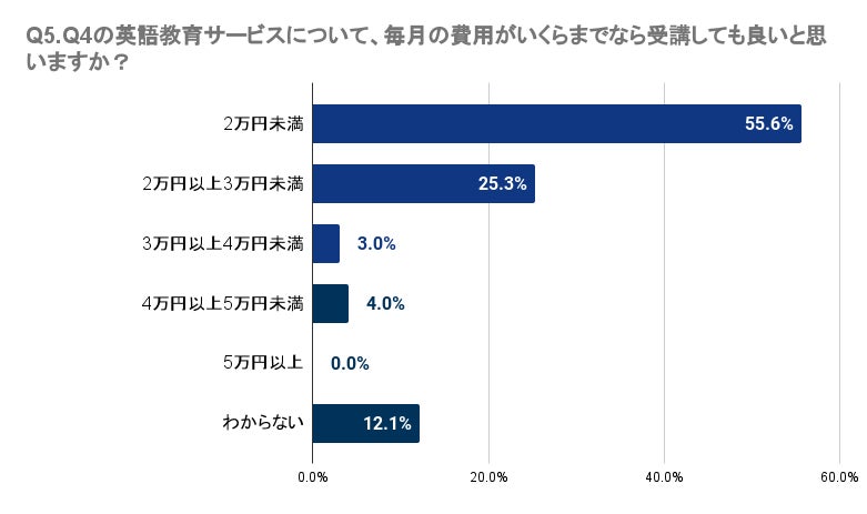 Q4で「受講したい」「料金が安ければ受講したい」「興味がある」と回答した人に、Q5で、「Q4の英語教育サービスについて、毎月の費用がいくらまでなら受講しても良いと思いますか?」と質問したところ、最も多い55.6%の回答者は2万円未満が適切と感じています。25.3%は2万円以上3万円未満、3.0%は3万円以上4万円未満と答えました。4万円以上の費用を考える回答者は極少数で、4万円以上5万円未満が4.0%、5万円以上が0.0%でした。これにより、愛媛県では多くの人が3万円未満の価格帯を望んでいることが明らかとなりました。