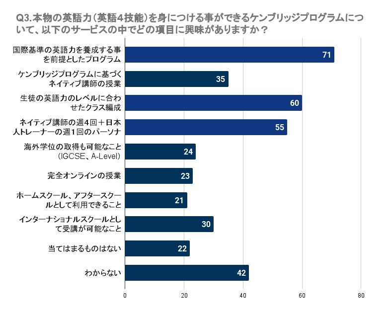 Q3で「本物の英語力(英語4技能)を身につける事ができるケンブリッジプログラムについて、以下のサービスの中でどの項目に興味がありますか?(複数回答可)」と質問したところ、愛媛県で最も多かったのは「国際基準の英語力を養成する事を前提としたプログラム」で71名でした。次いで、「生徒の英語力のレベルに合わせたクラス編成」には60名、「ネイティブ講師の週4回+日本人トレーナーの週1回のパーソナルトレーニング」には55名が興味を持っています。一方で、「完全オンラインの授業」や「ホームスクール、アフタースクールとして利用できること」に関心を持つ人はやや少なめで、それぞれ23名、21名の回答でした。これらの結果から、多くの人は実用的な英語力の養成や個別のニーズに応じた指導に重きを置いていることが伺えます。