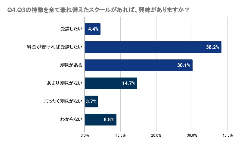 Q4で「Q3の特徴を全て兼ね備えたスクールがあれば、興味がありますか?」と質問したところ、愛媛県では4.4%が受講を希望し、38.2%は料金が手頃であれば受講したいと考えています。さらに、30.1%は興味を示していると回答しました。多くの人がこのような特徴を持つスクールに一定の興味を示していることが分かります。