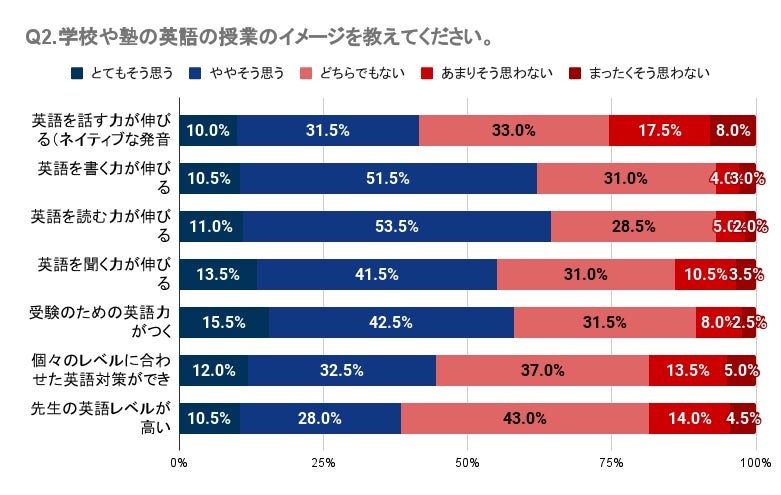 Q1・Q2では、子どもが英会話スクールや英語塾に通っていたが英語力アップの効果を感じていない人が一定数いること、学校や塾の英語の授業に対して明確な効果や良い印象を持てていない人が多いことが明らかになりました。