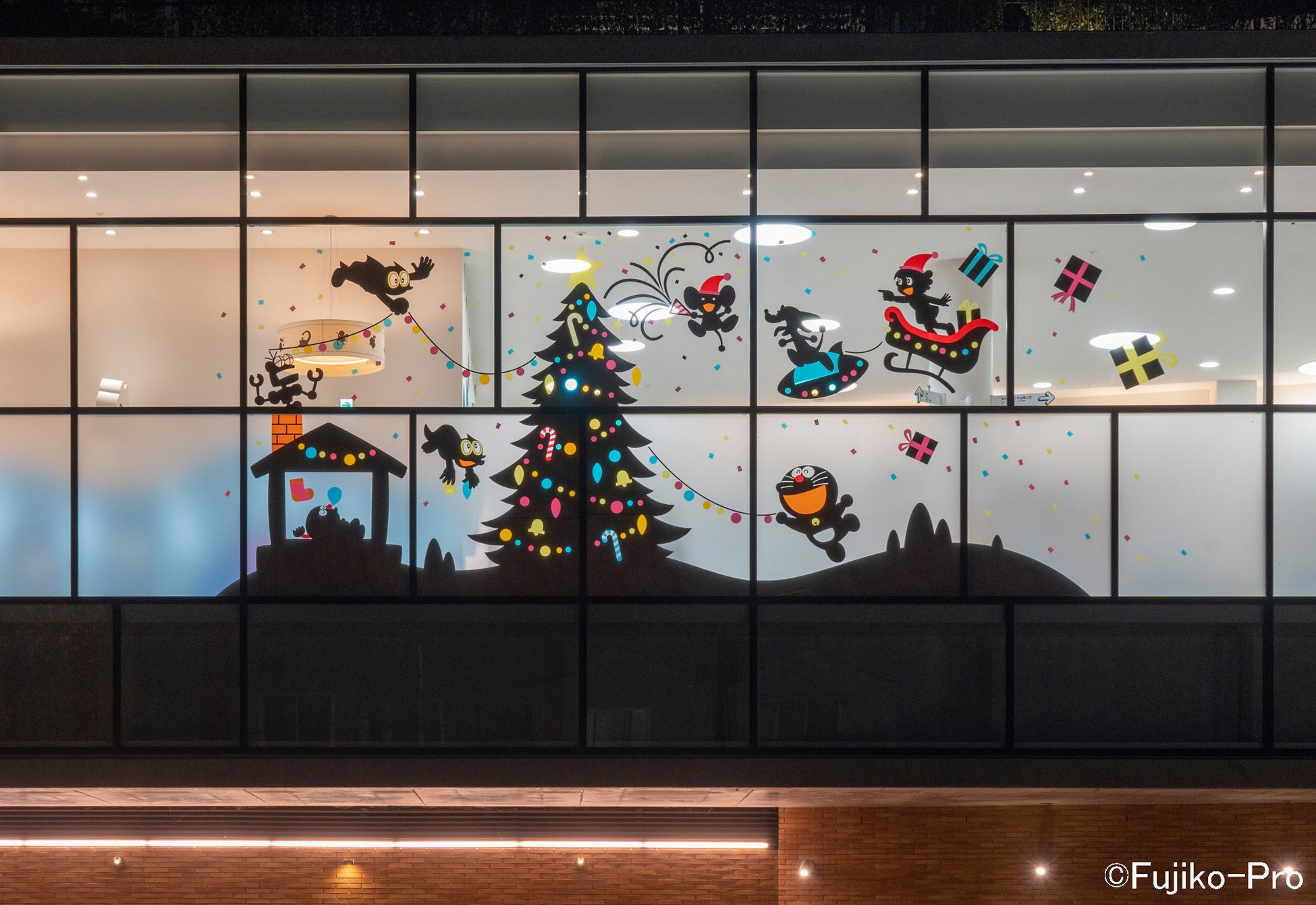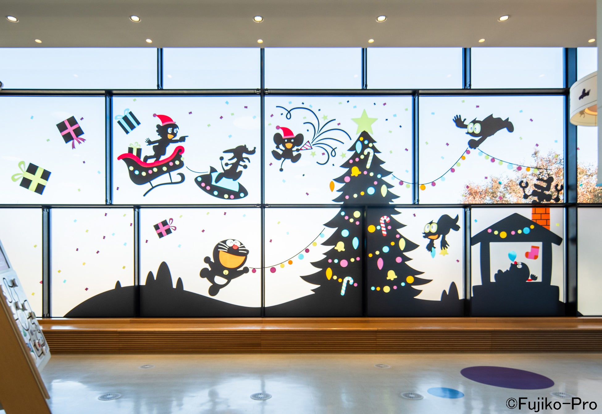 2階「みんなのひろば」の大窓には、クリスマスを楽しむFキャラクターたちの姿が!