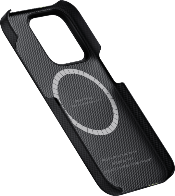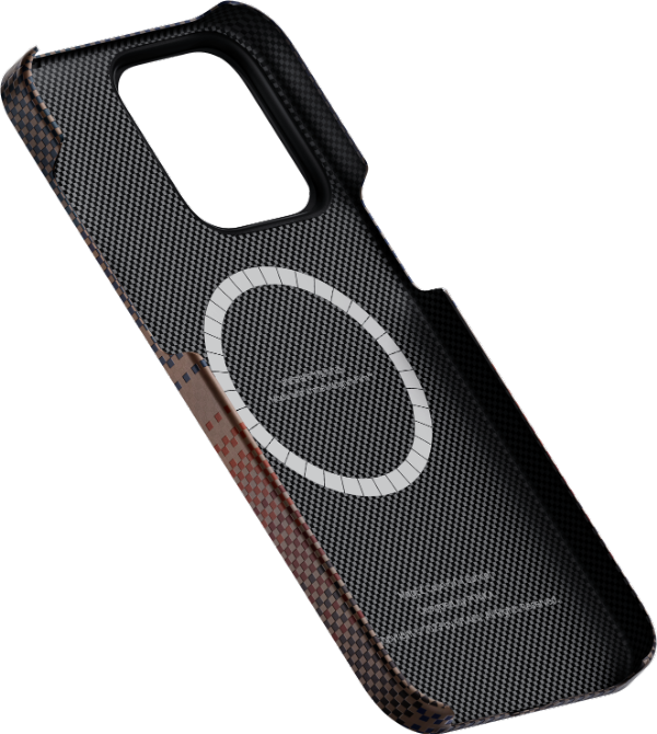 PITAKAが2023年に開発した画期的な接着剤不要のマグネットコーティング技術で、MagEZ Case 5シリーズに初めて採用されました。アンバーマグネットフィルム™技術の原理は、磁石( N52SH MagSafeマグネットアレーモジュール)の表面に特殊なコーティング技術を施し、ケース素材のアラミド繊維や樹脂と融合する外層を形成し、磁石があたかも琥珀(アンバー)のように繊維に包み込まれています。磁石(マグネット)の外側が繊維や樹脂に完全に浸透・融合しているため、磁石は希望の位置に確実にセットされ、従来の接着剤による固定で問題となる磁石の脱落や欠損を回避可能です。そして、特にスマートフォンのような熱源に常時接触している場合、接着剤の不具合によってさらに制御不能になる危険性を回避することができます。 同時に、アンバーマグネットフィルムは、水を使用しない技術であるため、人の健康や環境にも非常に優れています。マグネットリングが見える状態になっていますが、マグネット部分が飛び出してiPhone 15の背面を傷つけることはありません。