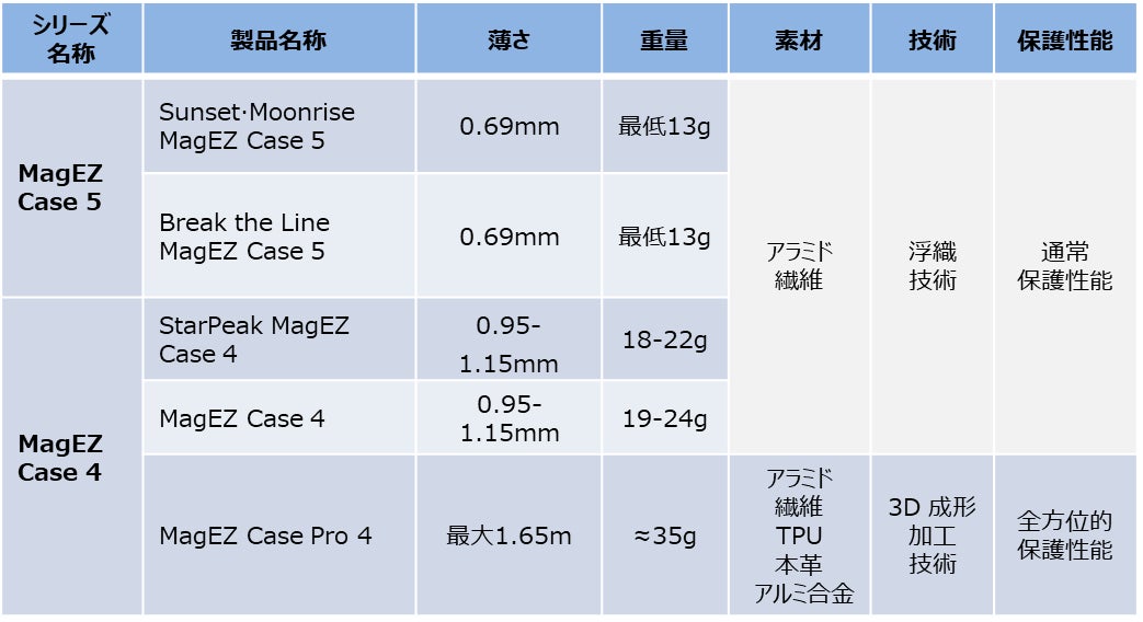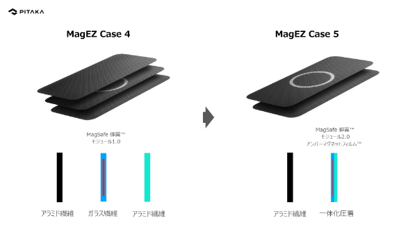 さらにMagSafe 蝉翼(せんよく)™ モジュール2.0技術では、さらなる進化として、N52SH MagSafeマグネットアレーモジュールのシートとアラミド繊維でできた保護ケースを一体化させることで、ケース全体の構成層数をMagEZ Case 4の3層からMagEZ Case 5では2層に減らし、iPhone 15用スマホケースの薄型化と軽量化を実現しました。