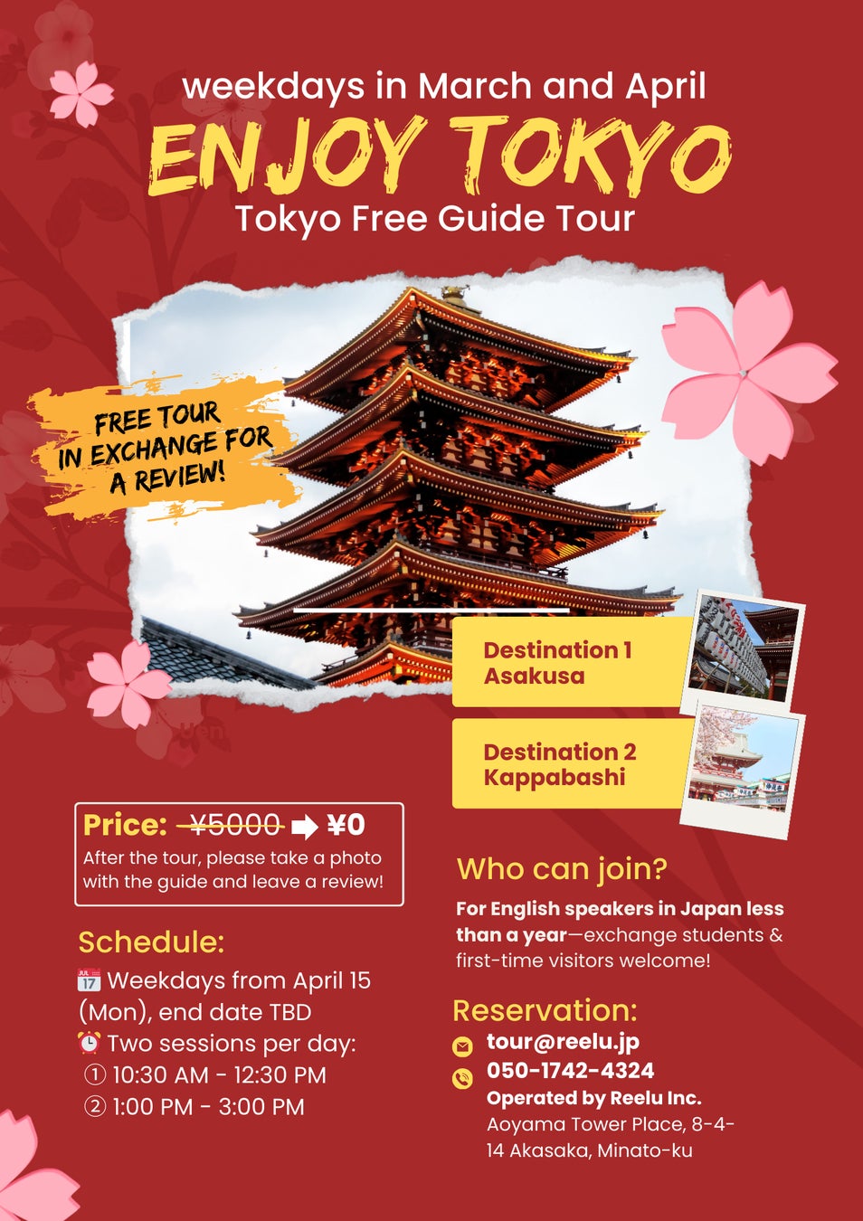 英語・中国語人材の即マッチングサービス「Reeluバイト」を運営する株式会社Reelu(本社:東京都、代表取締役:今野珠優)は、訪日外国人旅行者向けのツアーガイド団体「Reelu Japan Guide」において、留学生向けに訪日観光ツアーの無償提供を開始しました。
