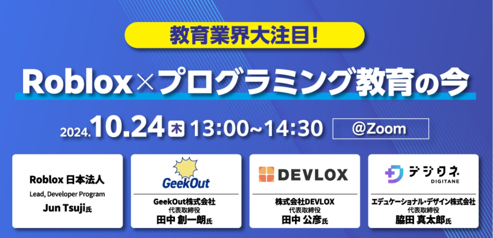 本セミナーではRoblox日本法人のご担当者をはじめ、Robloxに精通した方々をゲストとしてお招きし、いま教育業界で大注目されているRobloxについて、「Robloxの日本における現状」と「Robloxとプログラミング教育の相性」を主テーマにお話しいたします。