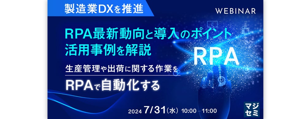 【WEBセミナー開催のご案内】「製造業DXを推進」RPA最新動向と導入のポイント、活用事例を解説 ~生産管理や出荷に関する作業を、RPAで自動化する~