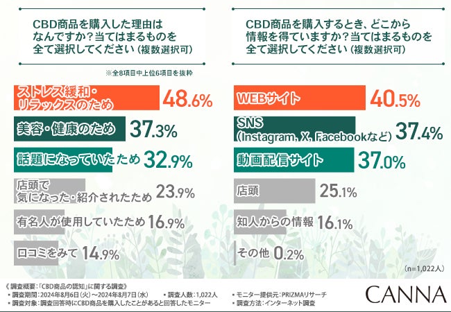 WEBサイトやSNS、動画配信サイトから情報を収集し、CBD商品を購入している方が多いことが明らかになりました。