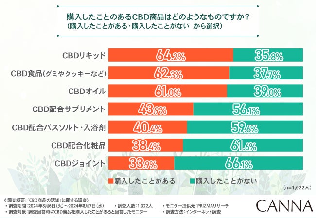 今回の調査で、CBD商品ではリキッド・食品・オイルの購入経験のある方がそれぞれ6割以上いることがわかり、人気が高いことが示されました。