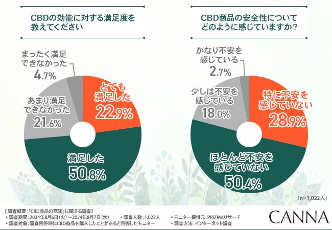 「CBDの効能に対する満足度を教えてください」と質問したところ、『とても満足した(22.9%)』『満足した(50.8%)』『あまり満足できなかった(21.6%)』『まったく満足できなかった(4.7%)』という回答結果になりました。