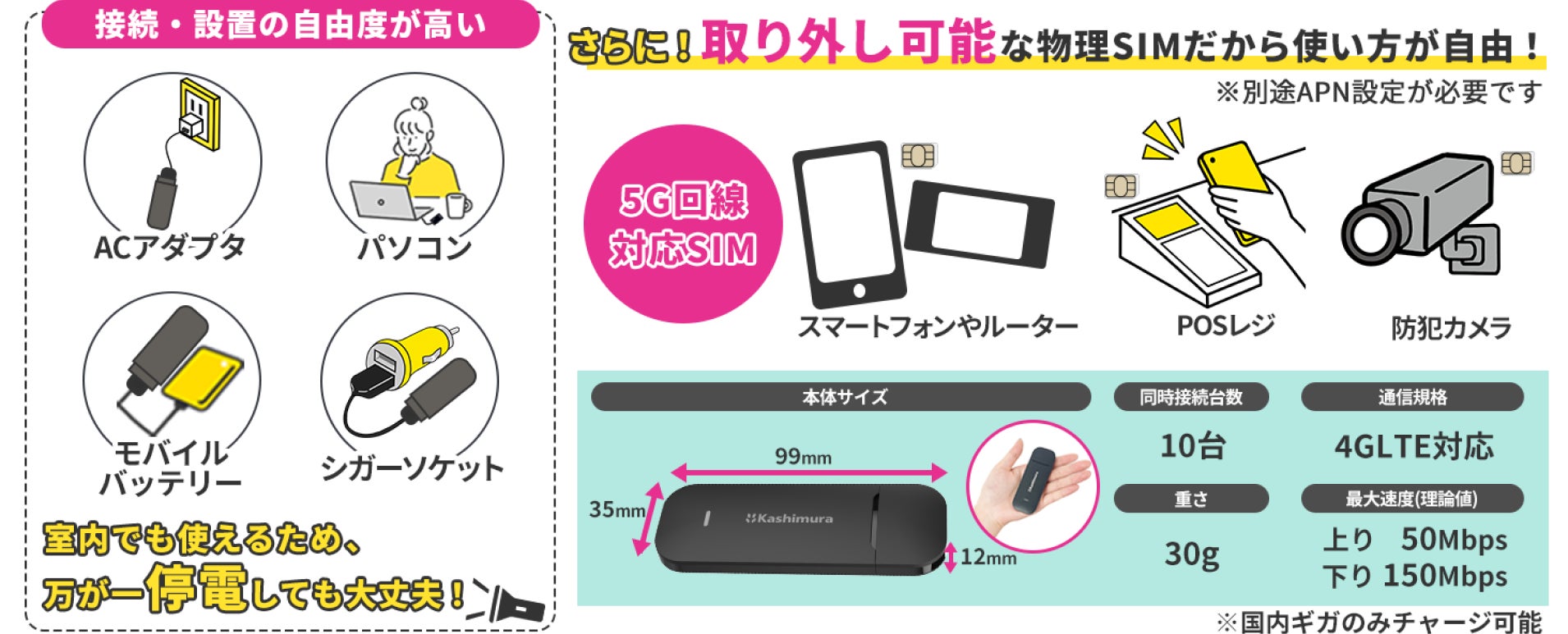 カシムラのルーター端末にSIM情報が設定済み(APN設定)のため、届いてからSIMの開通登録をするだけで使用することができます。