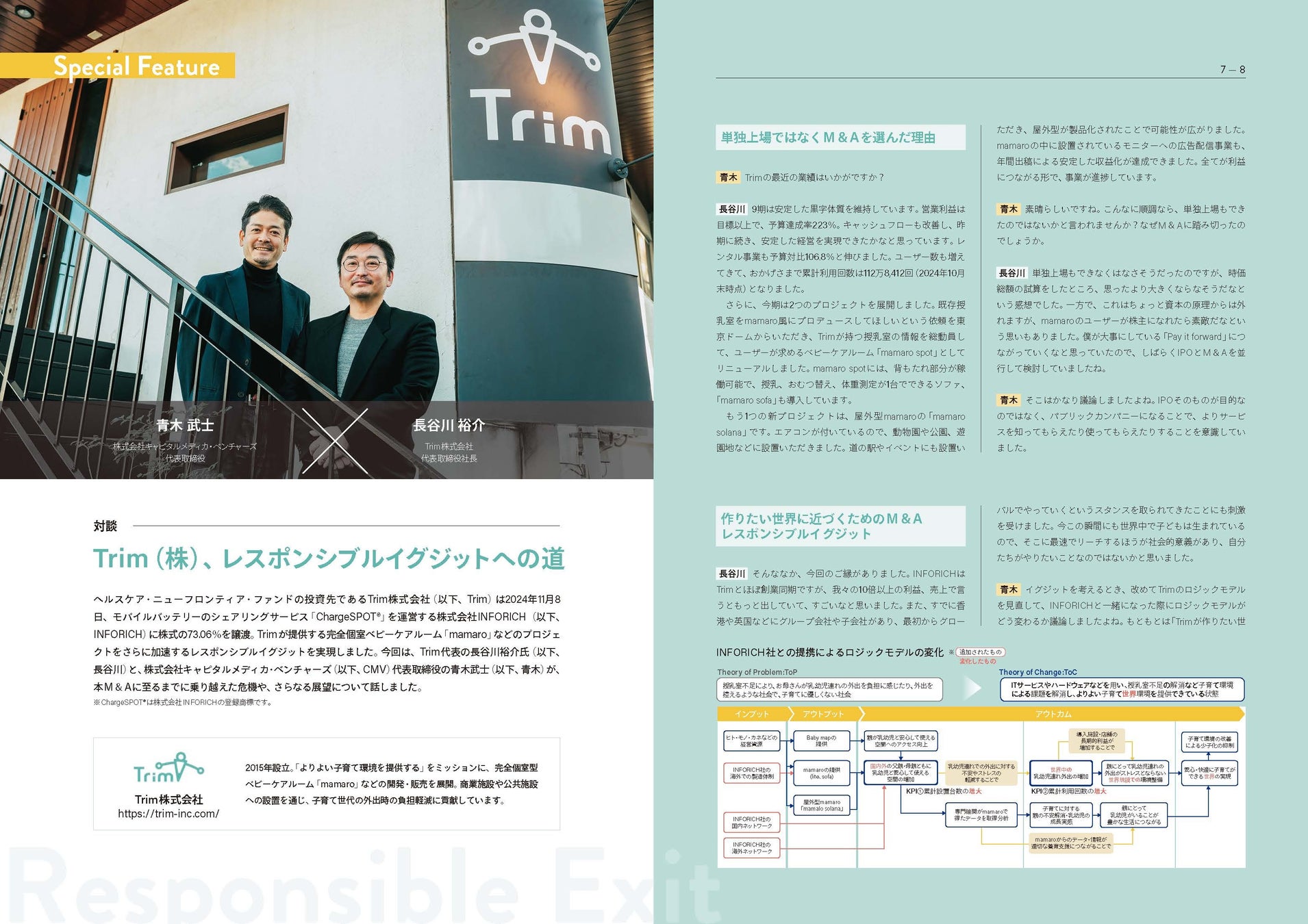 また、ヘルスケア・ニューフロンティア・ファンドの投資先であるTrim株式会社(以下、Trim)がモバイルバッテリーのシェアリングサービス「ChargeSPOT®」を運営する株式会社INFORICHに株式の73.06%を譲渡したことから、今回のインパクトレポートにおいて「Trim(株)、レスポンシブルイグジットへの道」と題した対談記事を掲載しています。本イグジットにより、Trimが提供する完全個室ベビーケアルーム「mamaro」などのプロジェクトをさらに加速することが期待されており、対談では、Trim代表の長谷川裕介氏と、CMV代表取締役の青木武士が、本M&Aに至るまでに乗り越えた危機や、さらなる展望について語っています。