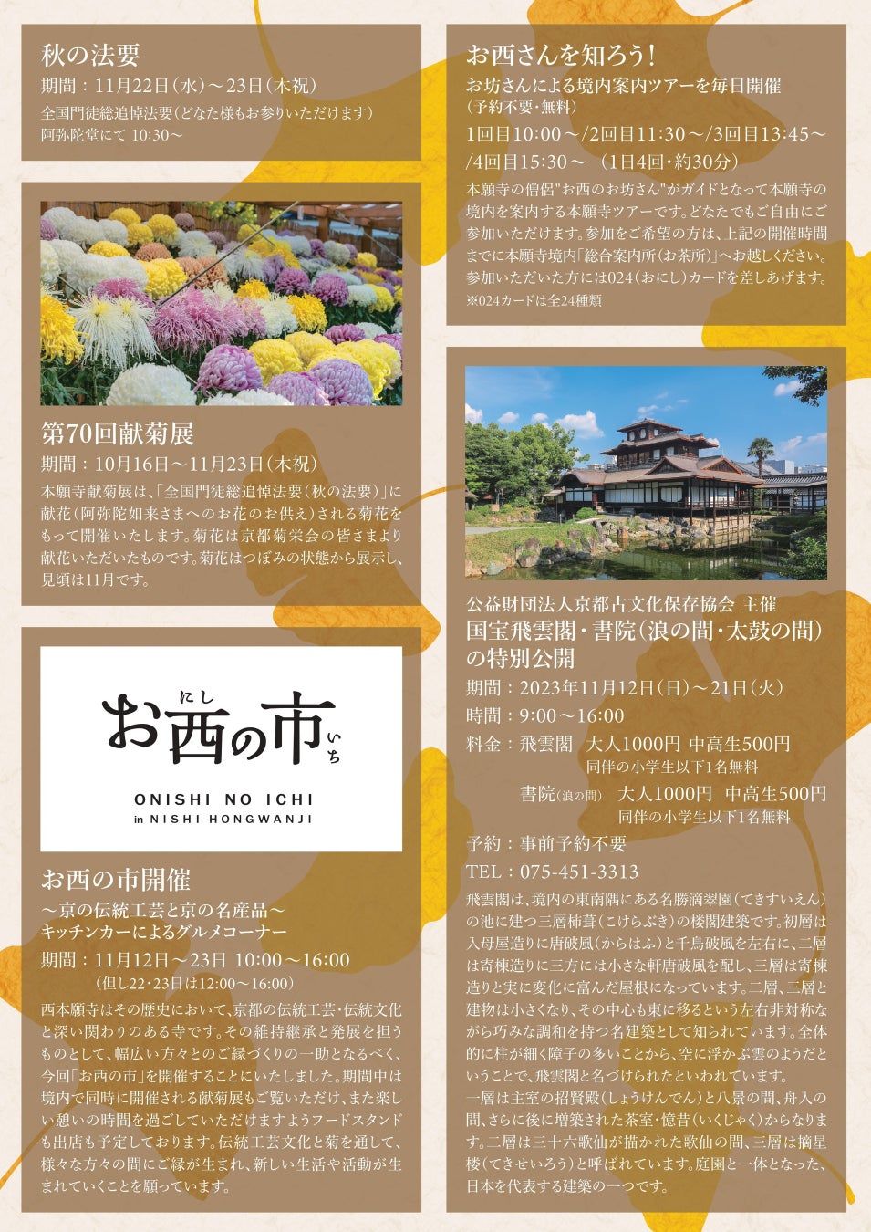 色々な催事を楽しみながら、秋の本願寺をごゆっくりご参拝いただけるまたとない機会です。この機会にぜひ、お越しください。