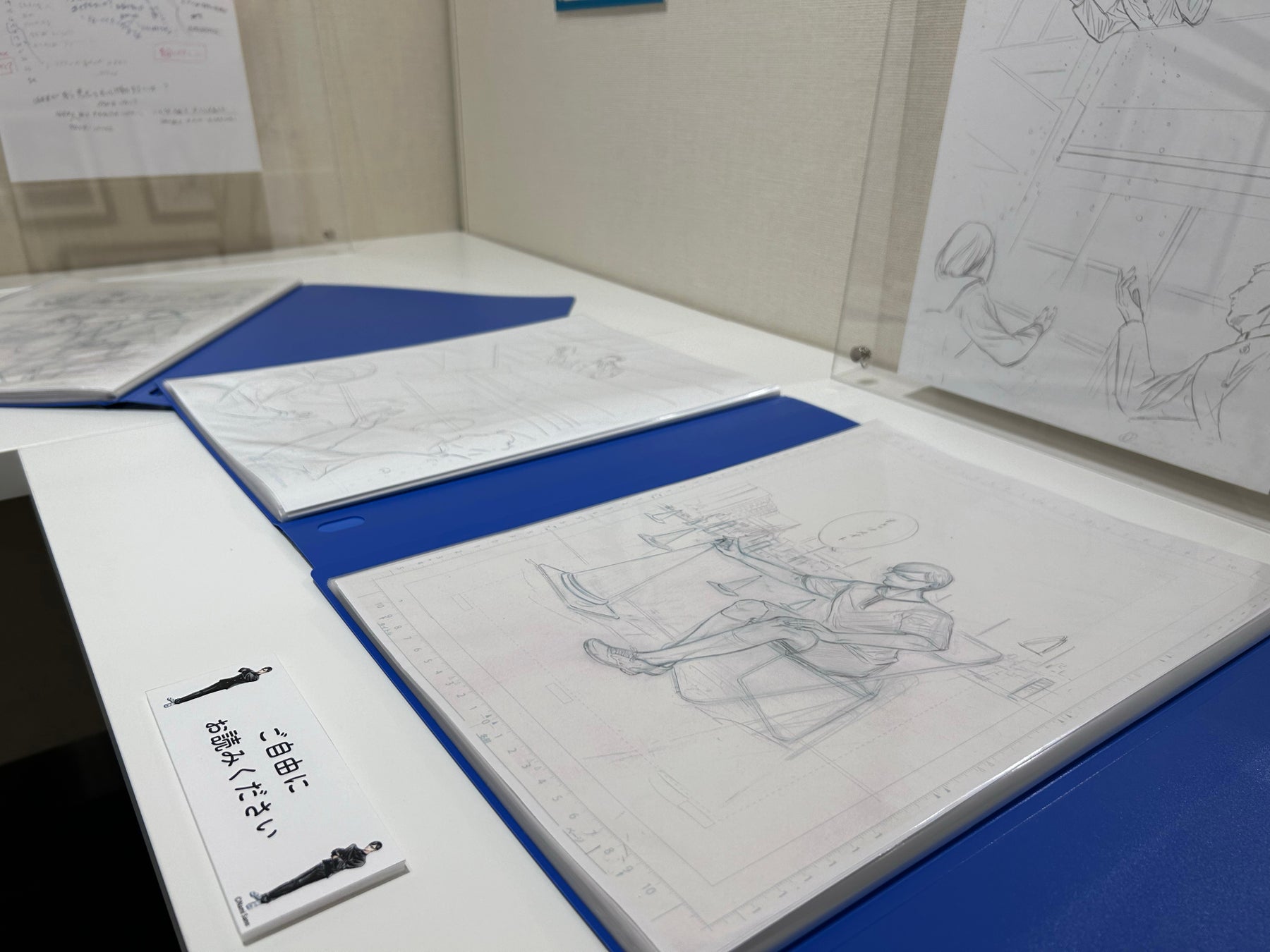 会場では、「坂本ですが?」「ミギとダリ」「佐野菜見作品集」のアナログ原画を間近で見ることができます。修正した跡や下書きの跡が残っており、原稿の制作過程を想像しながら見る楽しみも。貴重な未公開ネーム・下描きの複製を手に取って読むこともでき、“ボツ”になった設定など、原画展でしか見られない資料が盛りだくさんです。