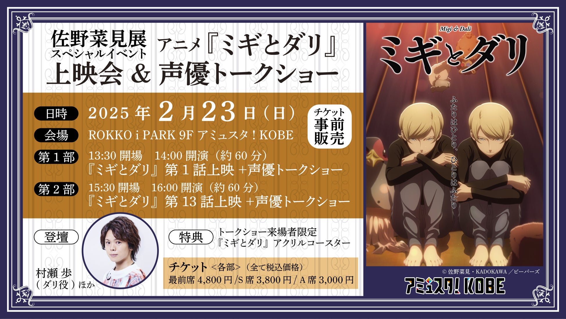 「アミュスタ!KOBE」 (所在地:兵庫県神戸市)では、2025年2月7日(金)から、株式会社KADOKAWAの人気作品「坂本ですが?」や「ミギとダリ」の作者 佐野菜見氏の原画展『佐野菜見展』を開催します。「ミギとダリ」の舞台となった“神戸”ということで、「ミギとダリ」の展示やイベントをパワーアップ。アニメ『ミギとダリ』の上映会や、声優・村瀬歩さんのスペシャルトークショーも開催決定。