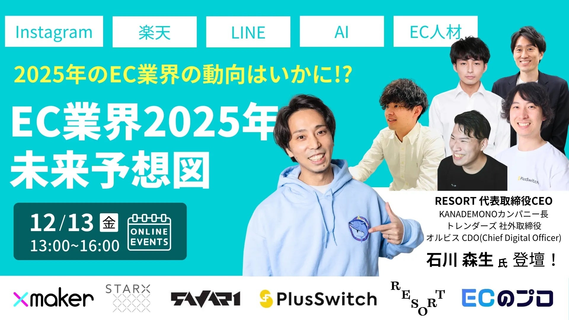 株式会社RESORT (本社所在地:東京都渋谷区)の代表取締役CEO:石川森生が2024年12月13日(金)に株式会社Xmaker、ムジン株式会社 主催の「EC業界2025年未来予想図」に登壇することをお知らせいたします。