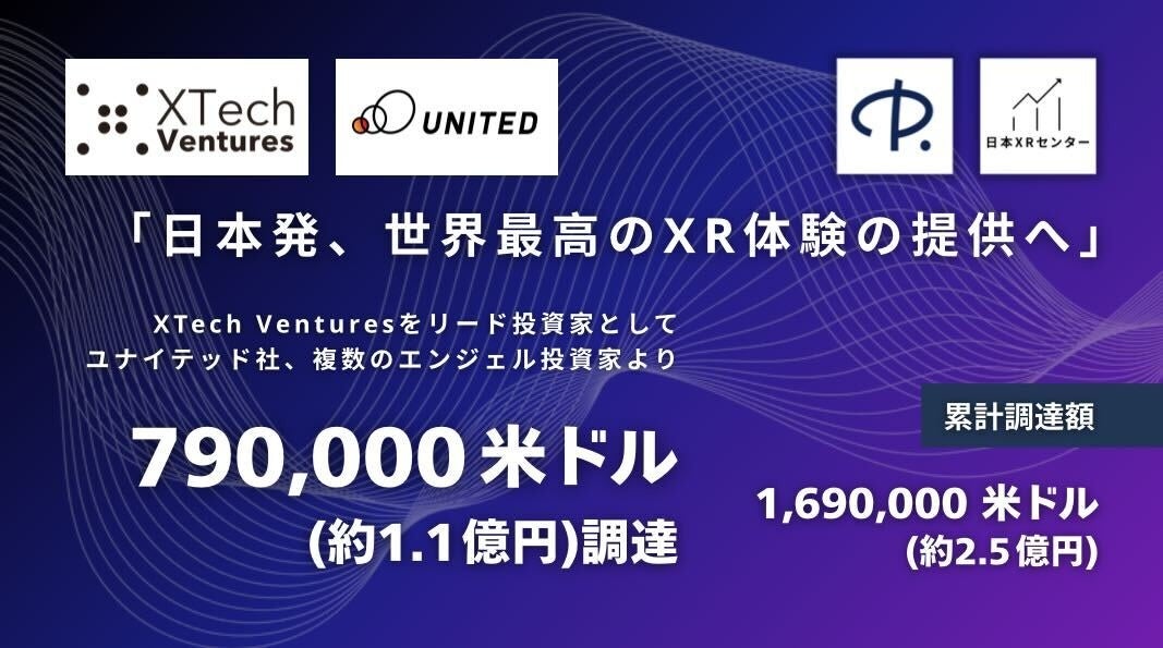 VRアトラクション及びVRトレーニングの企画開発を行うPotlatch, inc(本社:米国カリフォルニア州、CEO: 小林大河、日本支社:株式会社日本XRセンター)は、XTech Venturesをリード投資家として、ユナイテッド社、複数のエンジェル投資家より、790,000米ドル(約1.1億円)の資金調達を実施しました。これまでの累計資金調達額は約2.4億円となります。調達した資金で、オリジナルVRアトラクションの開発及び店舗展開の加速をします。