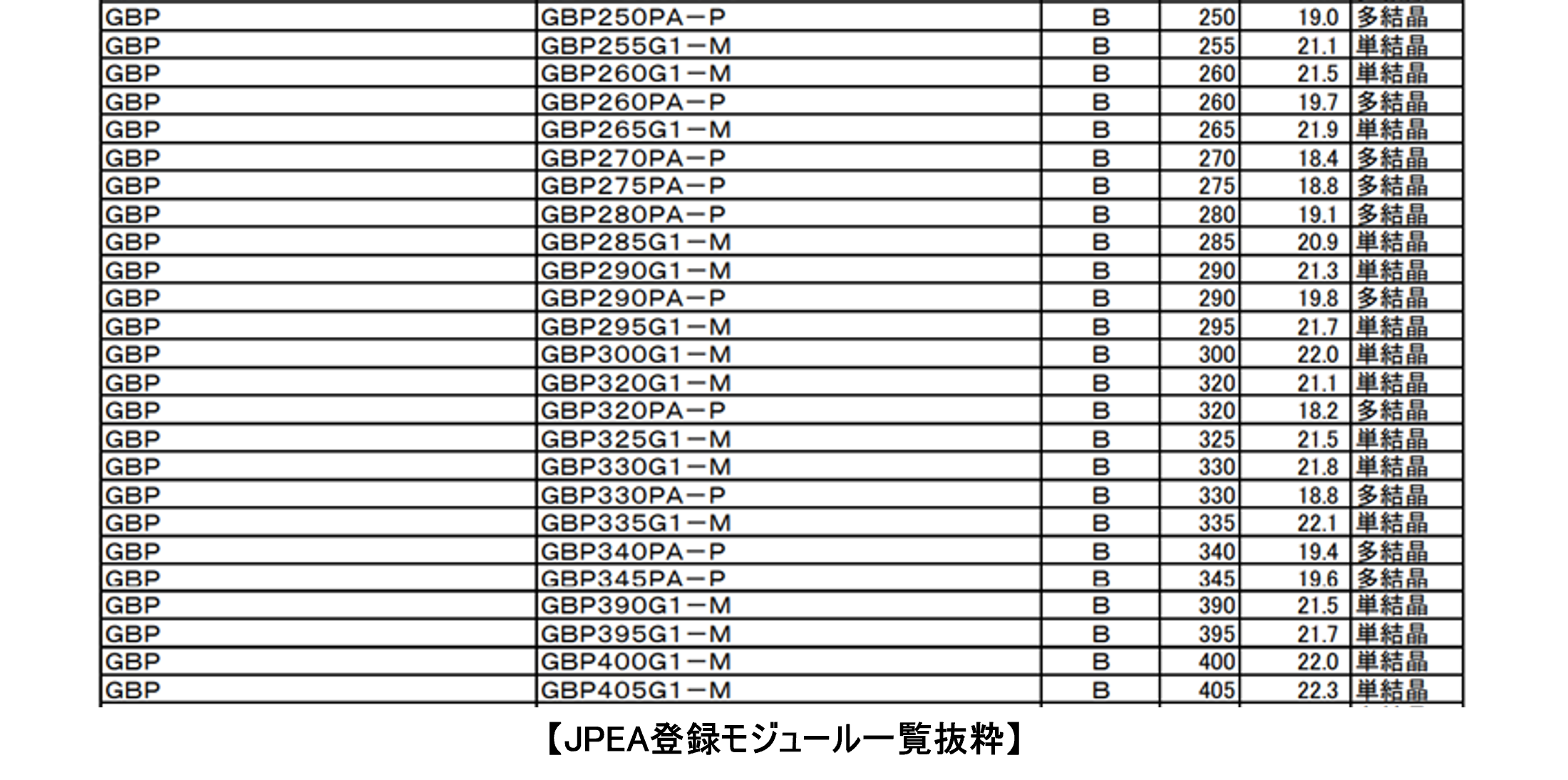 もしパネルが故障した場合、パネルメーカーは最新の高出力パネルを提案することが多いですが、そのパネルでFIT法を維持するためには、総枚数が減らさないといけません。総枚数の変更に伴うストリングの組み直しや不均一は逆流の原因となる可能性があります。また、バイパス用のケーブル設置が必要な場合もあります。そのため、同じ出力のパネルを手配する方が簡単です。GBPはJPEA認定を受けており、かつ同出力・同サイズのパネルを提供しております。