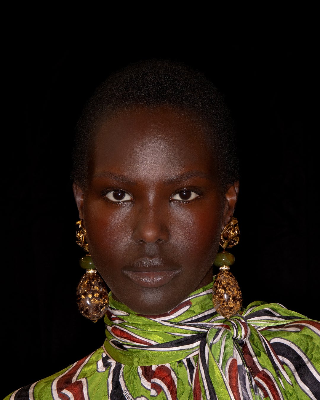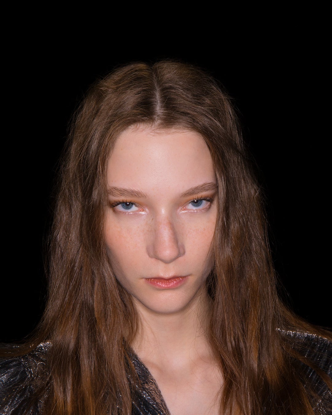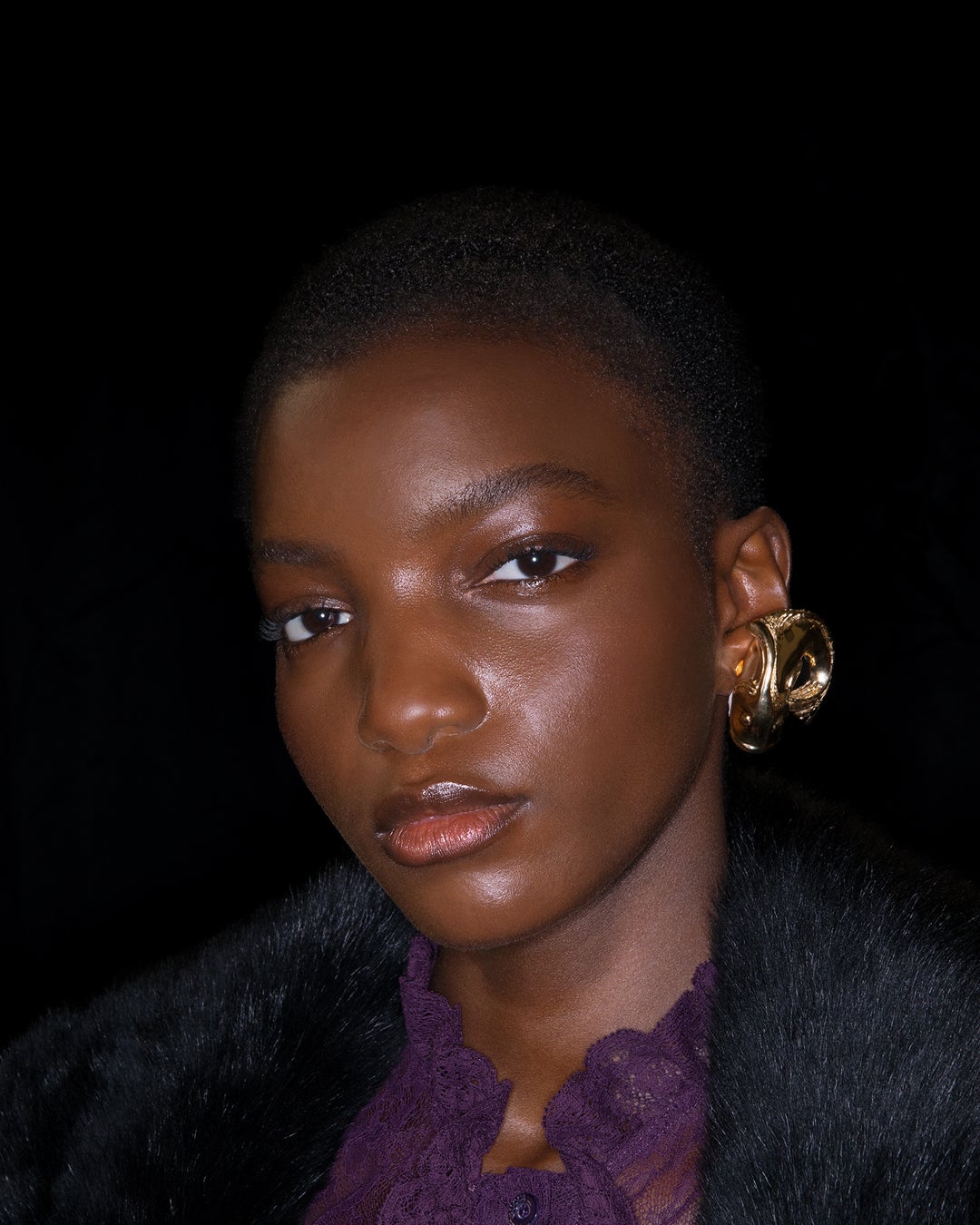 今回のメイクアップ ルックは、みずみずしく輝く素肌感を生かした、ナチュラルな美しい仕上がりに。「グッチ パレット ドゥ ボーテ クアチュオール」でさりげない彩りをプラスし、「グッチ グロウ ハイライター」で顔立ちをやわらかく引き立て、目頭、眉骨下、鼻先、頬に繊細な輝きを添えました。