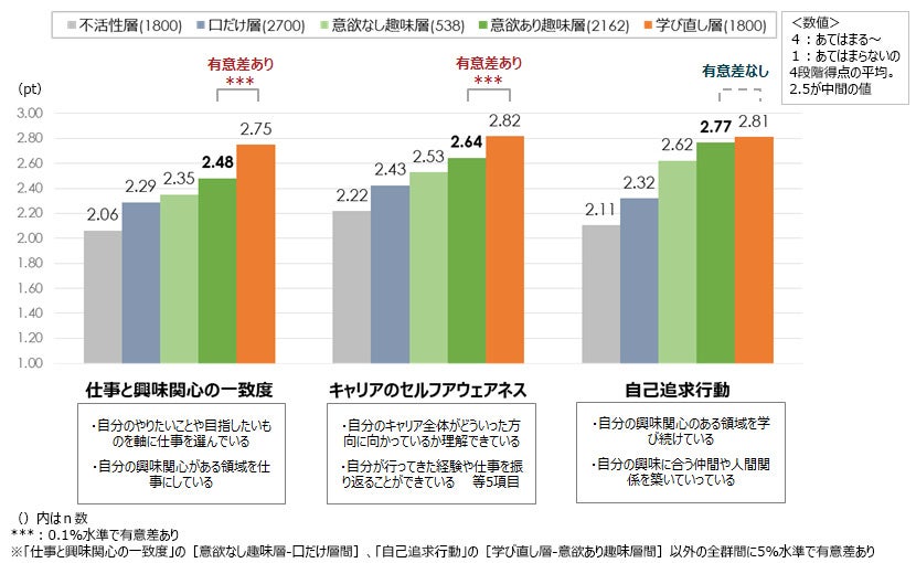⑫ しかし、意欲あり趣味層は、仕事やキャリアに関することを学び直す意欲や行動を高める「仕事と興味関心の一致度」や「キャリアのセルフアウェアネス※5」が学び直し層よりも低い(その他の層よりは学び直し層に近い)。