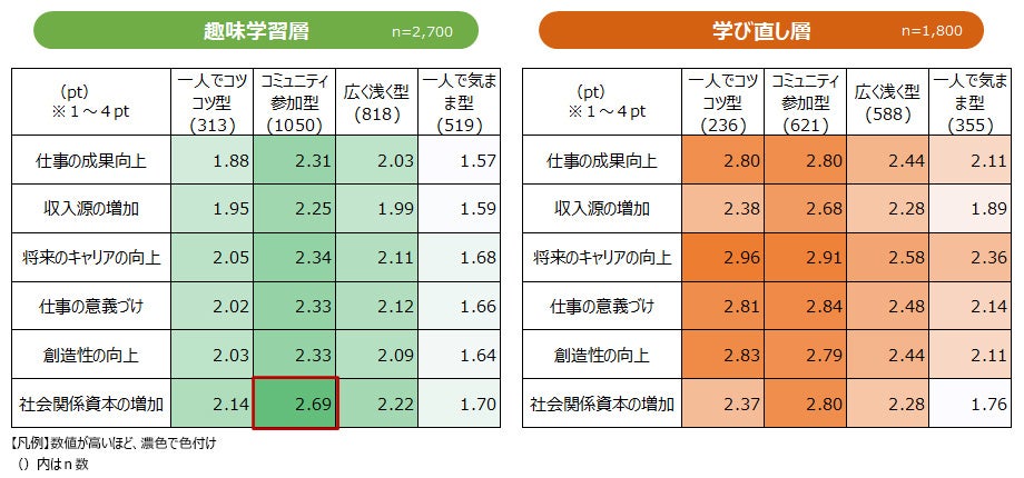 趣味について仲間と学ぶ「コミュニティ参加型」の学習は、仕事や収入への効果が高い傾向