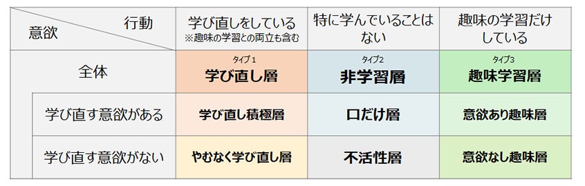 【学び直しのタイプ】 本調査では、学び直す意欲と学習実施状況に基づき、以下の3タイプ(詳細6タイプ)に分類。