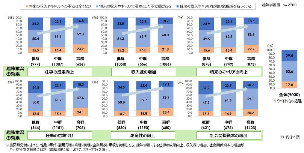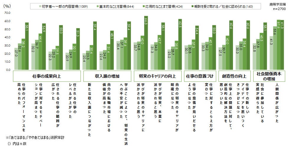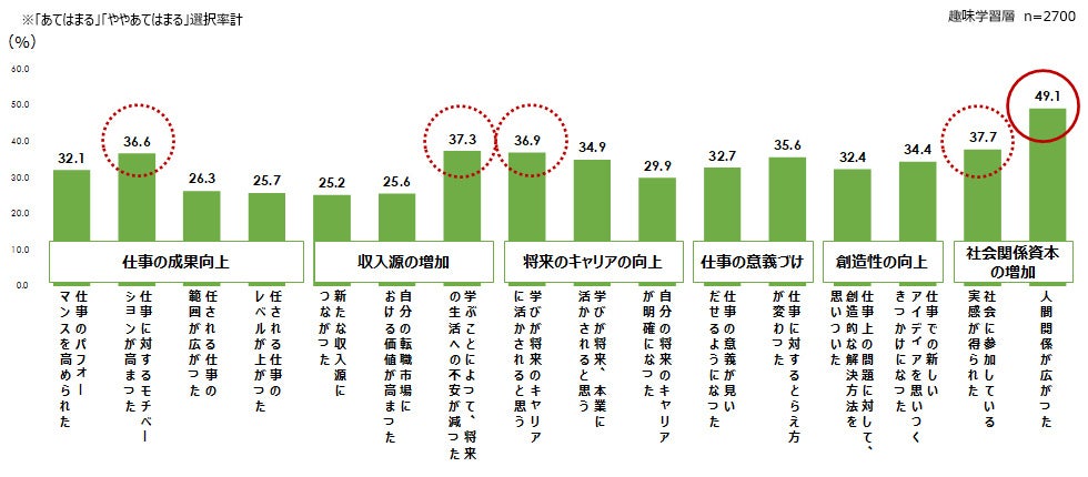 趣味の学習は、「人間関係が広がる」、「将来のキャリアや生活不安の解消に活きる」