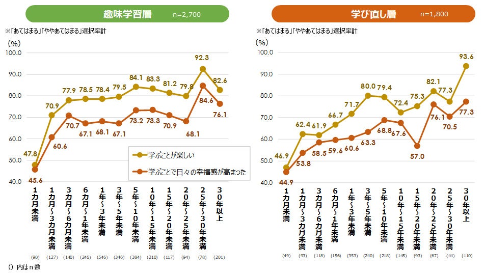 ⑩ 「学ぶことが楽しい」といった趣味の学習による幸福感を感じる割合は、学習期間3か月~6か月未満で急激に高まり、学び直し層よりも短期間で幸福感を感じる傾向。