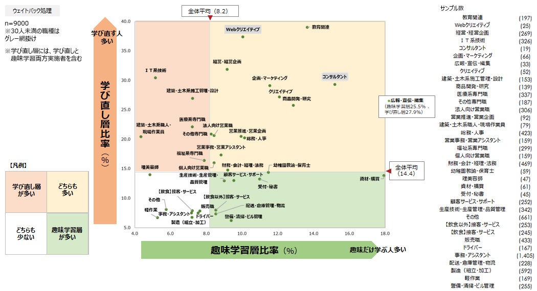 ③ 「広報・宣伝・編集」「コンサルタント」「教育関連」「Webクリエイティブ」などは、学び直し層、趣味学習層ともに多い。知的でクリエイティブな職種は、仕事・趣味問わず学習行為に積極的なことがうかがえる一方で、学び直しはせず趣味の学びしかしていない人も多い。