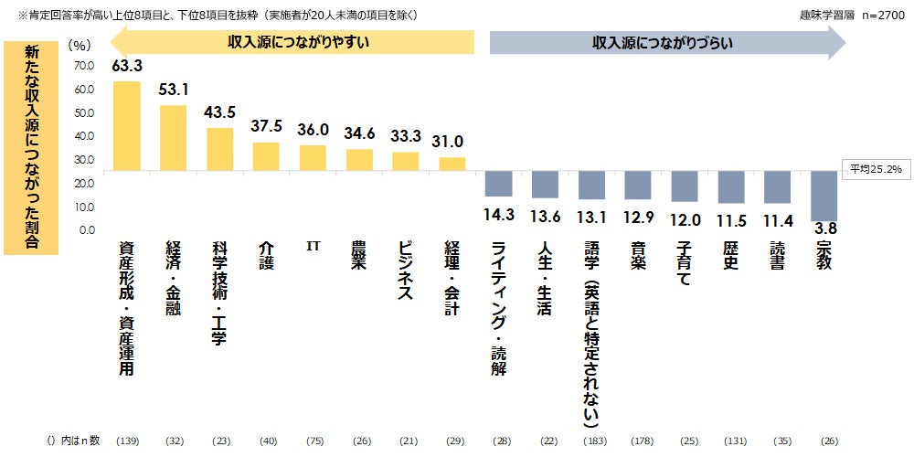 ⑦ 「新たな収入源につながった」割合が多い趣味の学習内容は、「資産形成・資産運用」「経済・金融」「科学技術・工学」「介護」等。 「宗教」「読書」「歴史」などは収入源につながっている割合が少ない。