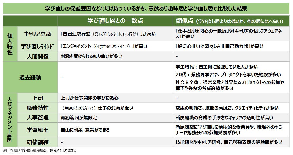 ⑪ 意欲あり趣味層(仕事やキャリアに関することを学び直す意欲があるが趣味の学習だけしている)は、ミドル・シニア就業者の学び直しを促す上で重要なポイントとなる「個人特性」や「学び方」などが、学び直し層と類似しており、その意味で、学び直しのポテンシャルがあると言える。