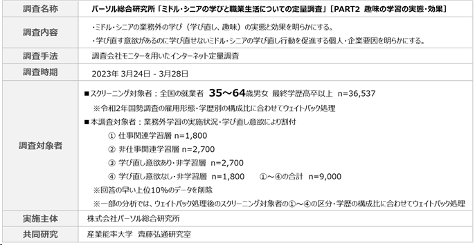 本調査では、仕事に関連はしないものの学びを行動化している「趣味学習層」※4に着目し、その実態を確認するとともに、趣味の学習は仕事やキャリアにどの程度効果があるのか、どうすれば学習対象を仕事や自身のキャリアにも向けることができるのかを把握することを目的に実施しました。