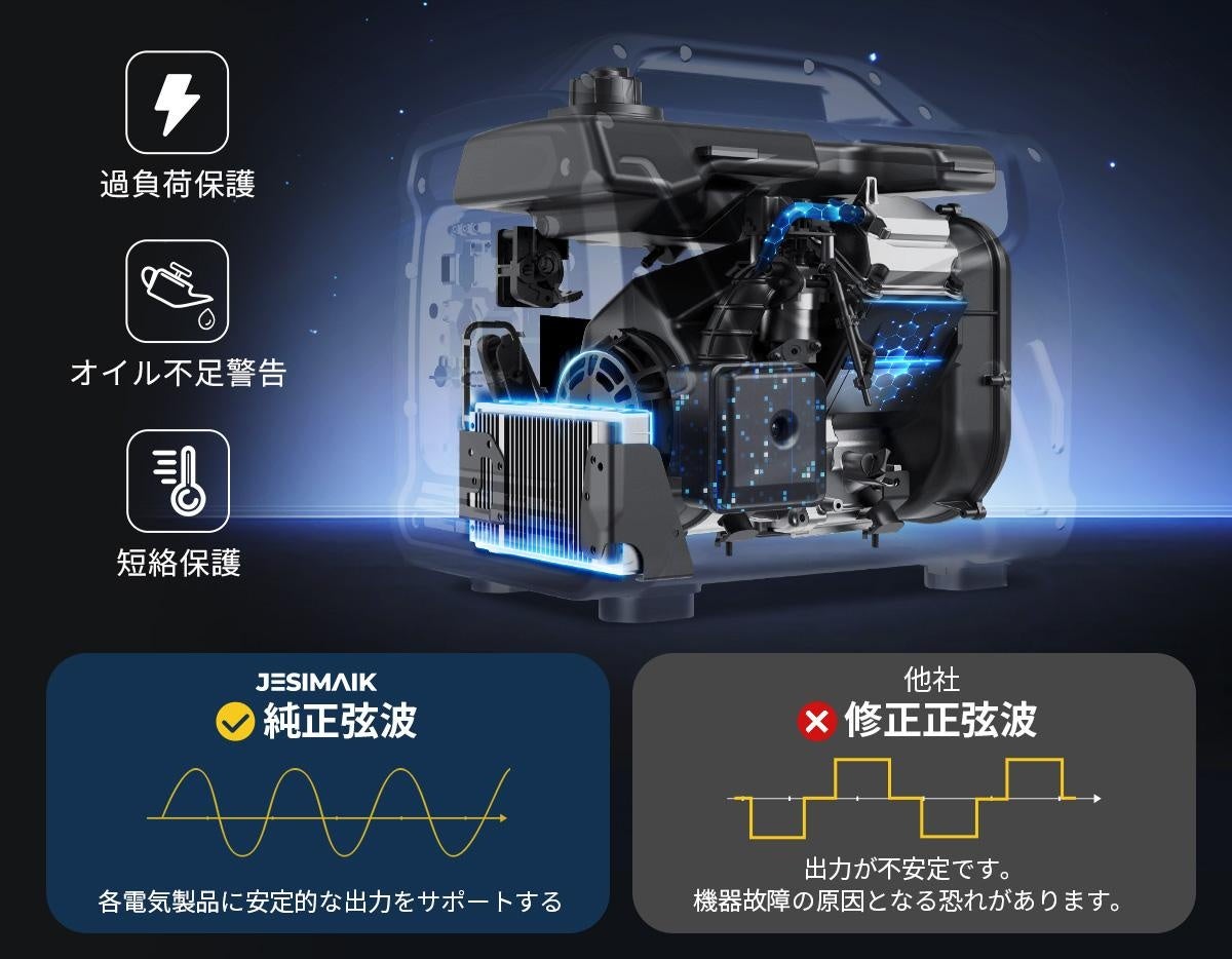 過負荷が発生した際には、交流保護装置が自動的に作動し、発電を停止させることで、発電機や接続した電気器具をしっかりと守ります。さらに、過熱保護装置やオイル不足警告機能も備えており、長時間の使用でも高い安全性を維持できます。