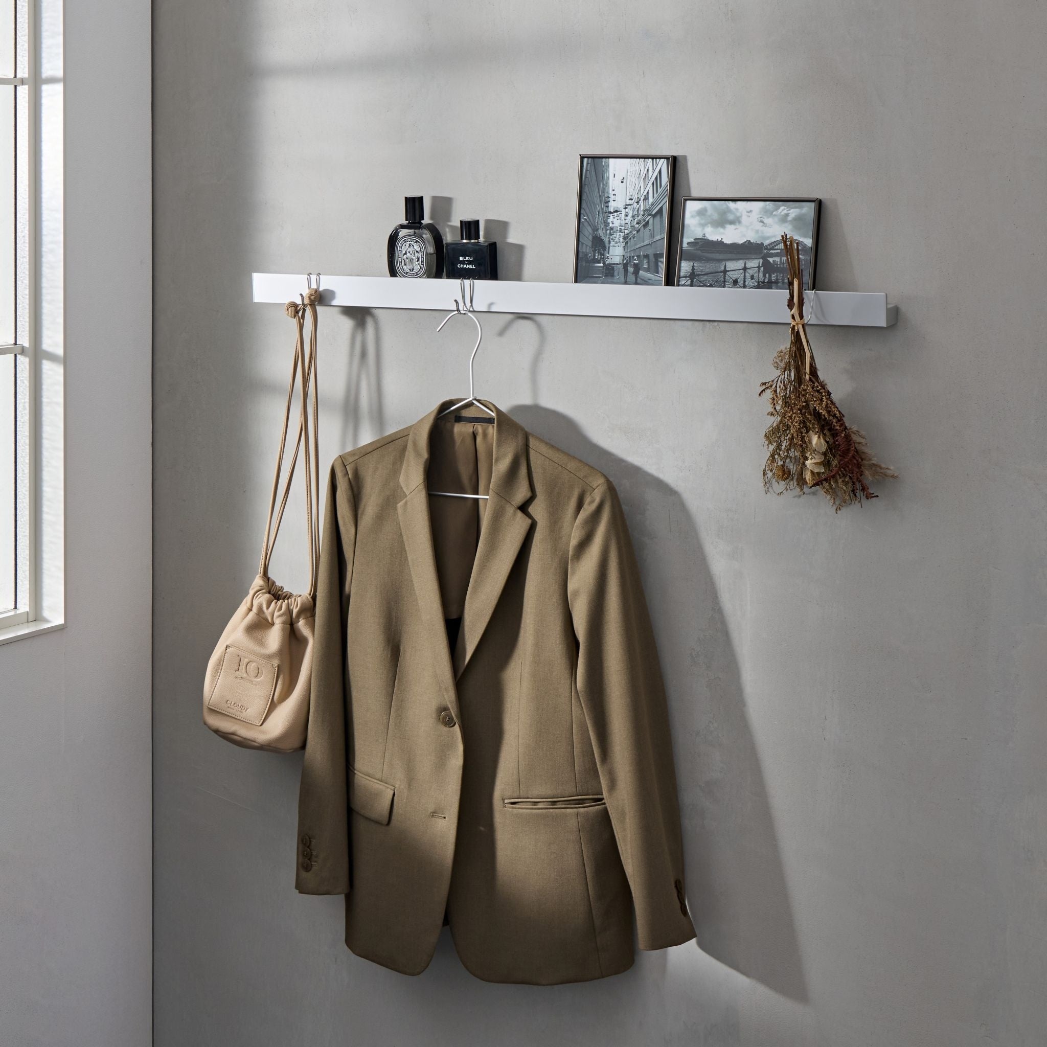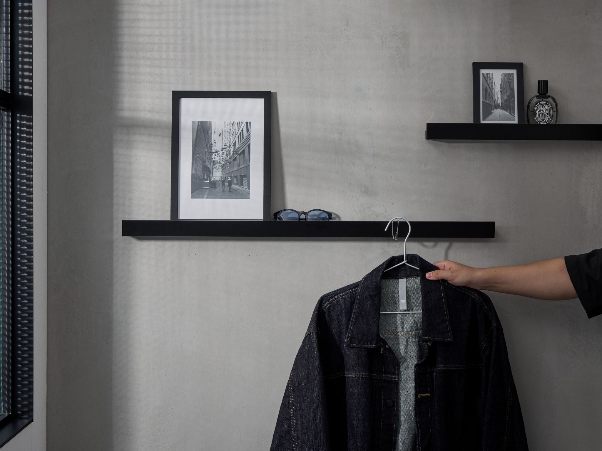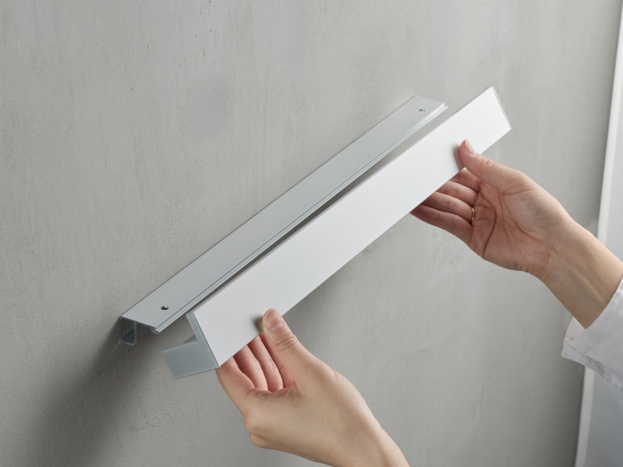 木製の伝統的な長押の機能性を、現代のインテリアに調和するミニマルなアルミのバーへと再構築。簡単に取り付けられ、美しく機能する“壁を使う暮らし”を提案します。