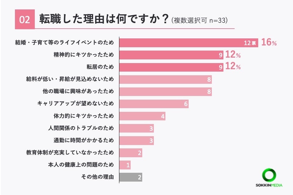 「Q2.転職をした理由は何ですか?(複数選択可)」という問いに対して、「結婚・子育て等のライフイベントのため」と回答した人が最も多く12票となりました。次いで「精神的にキツかったため」「転居のため」が同票の9票となっています。