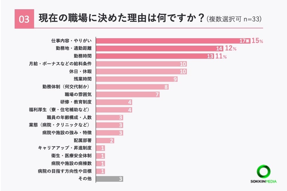 「Q3. 現在の職場に決めた理由はなんですか?(複数選択可)」という問いに対して、「仕事内容・やりがい」と回答した人が最も多く17票となりました。次いで「勤務地・通勤距離」が14票、「勤務時間」が13票となっています。