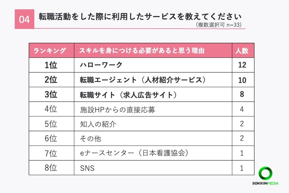 「Q4.転職活動をした際に利用したサービスを教えてください。(複数選択可)」という問いに対して、「ハローワーク」という声が最も多く挙がり、12票でした。次いで「転職エージェント(人材紹介サービス)」が10票、「転職サイト(求人広告サイト)」が8票となっています。