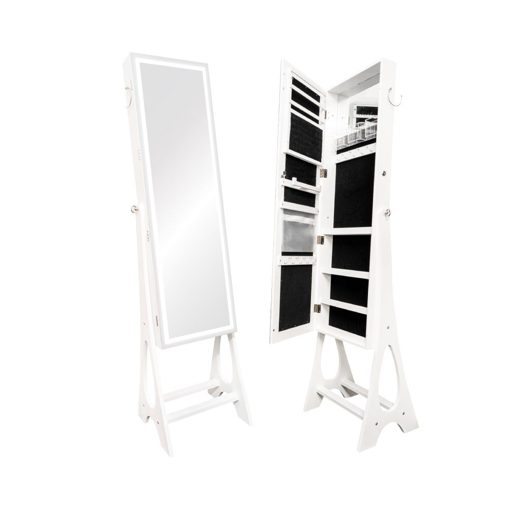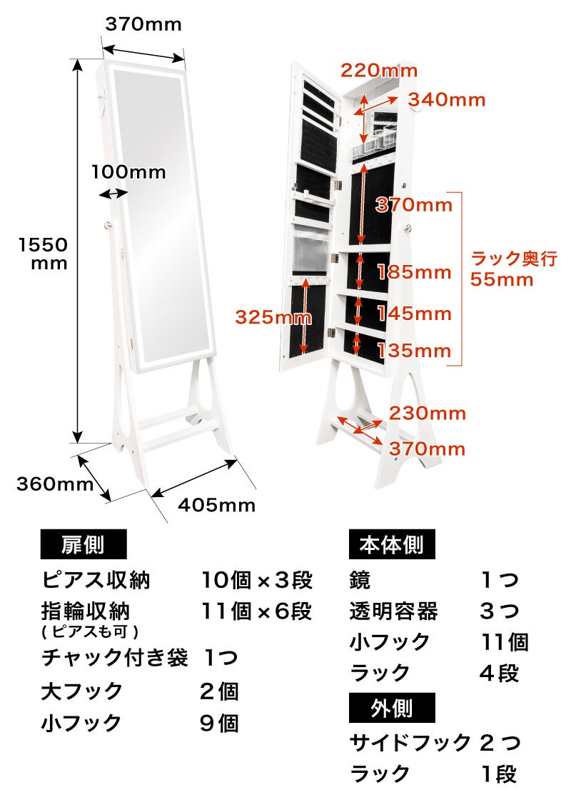 本製品は扉を開けて中に小物やアクセサリーを収納できるLED付き全身鏡です。